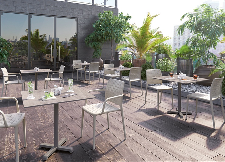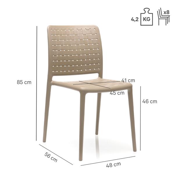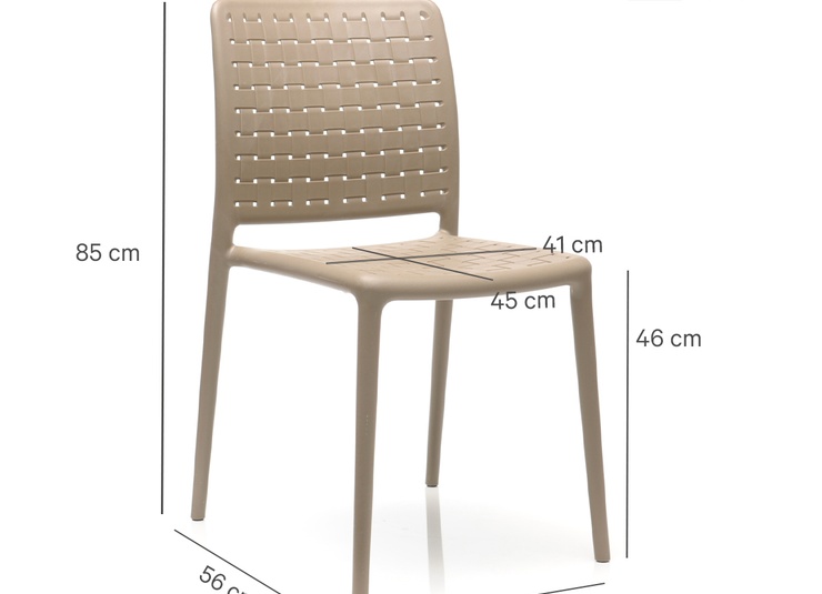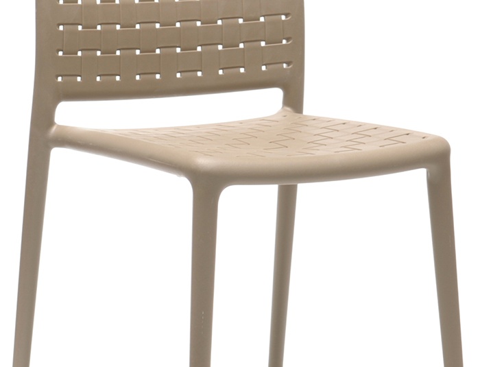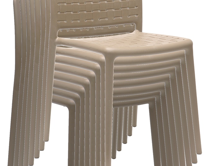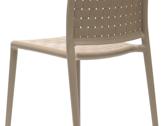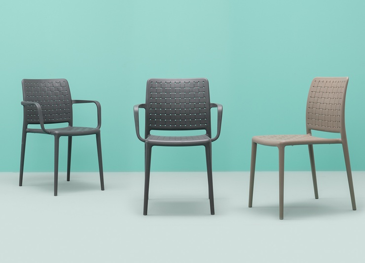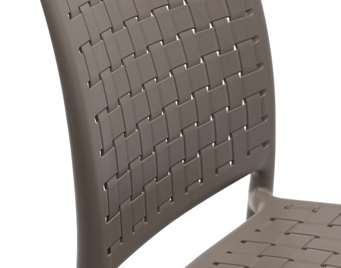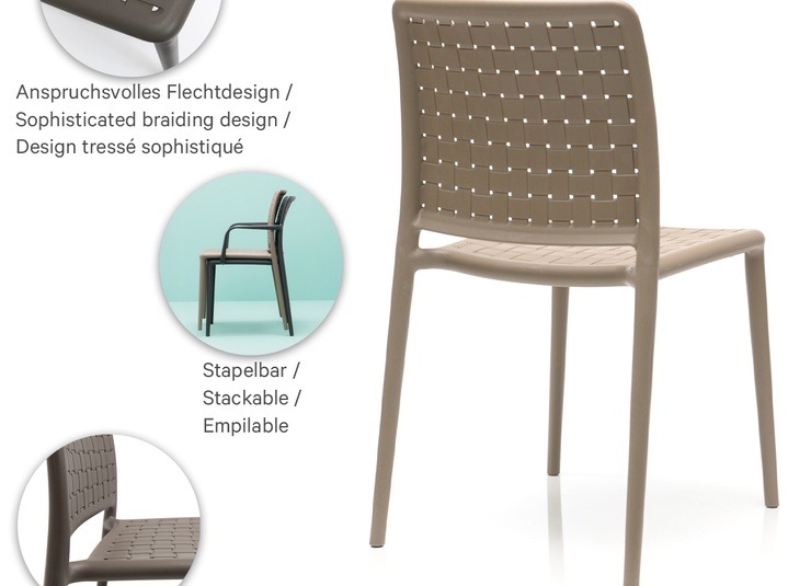 L'aspect tressé et le design original caractérisent la chaise empilable monobloc en polypropylène renforcé de fibre de verre, disponible avec ou sans accoudoirs dans les couleurs taupe et anthracite.Numéro d'article